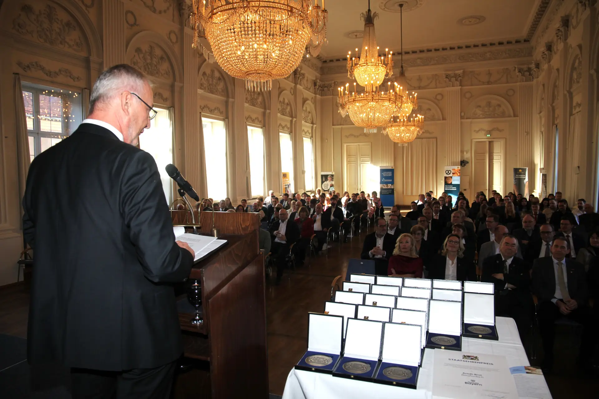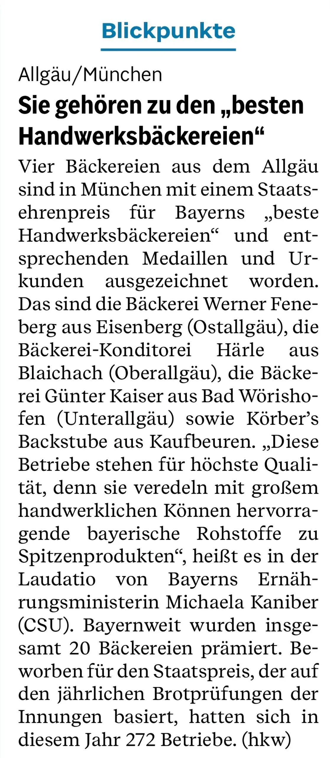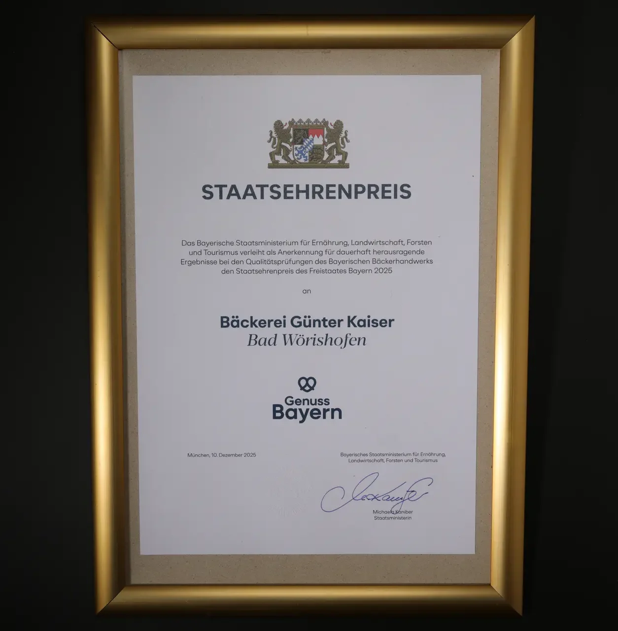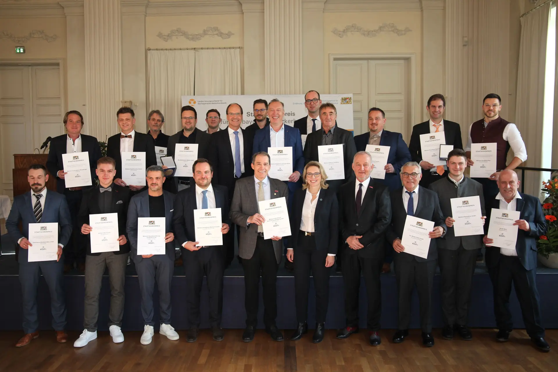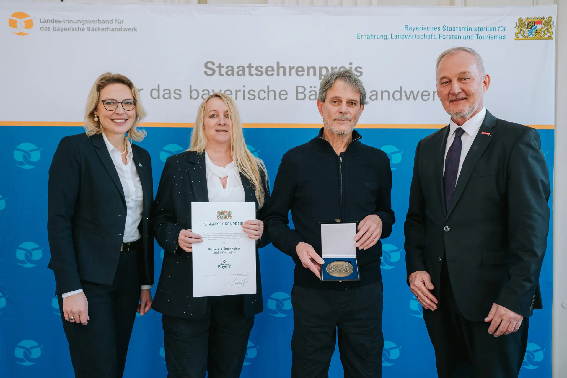Nicht nur Wissen und Kompetenz erfordert das Backhandwerk, sondern auch Herz und Gespür. Die sprichwörtlichen Meister ihres Faches – die 20 besten bayerischen Bäckereien – hat Abteilungsleiterin Alexandra Schenk in Vertretung von Ernährungsministerin Michaela Kaniber mit dem Staatsehrenpreis des Bäckerhandwerks 2025 ausgezeichnet. Gemeinsam mit Günter Wagner, Landesinnungsmeister des bayerischen Bäckerhandwerks, überreichte Schenk im Max-Joseph-Saal der Residenz Medaillen und Urkunden an die Preisträger.